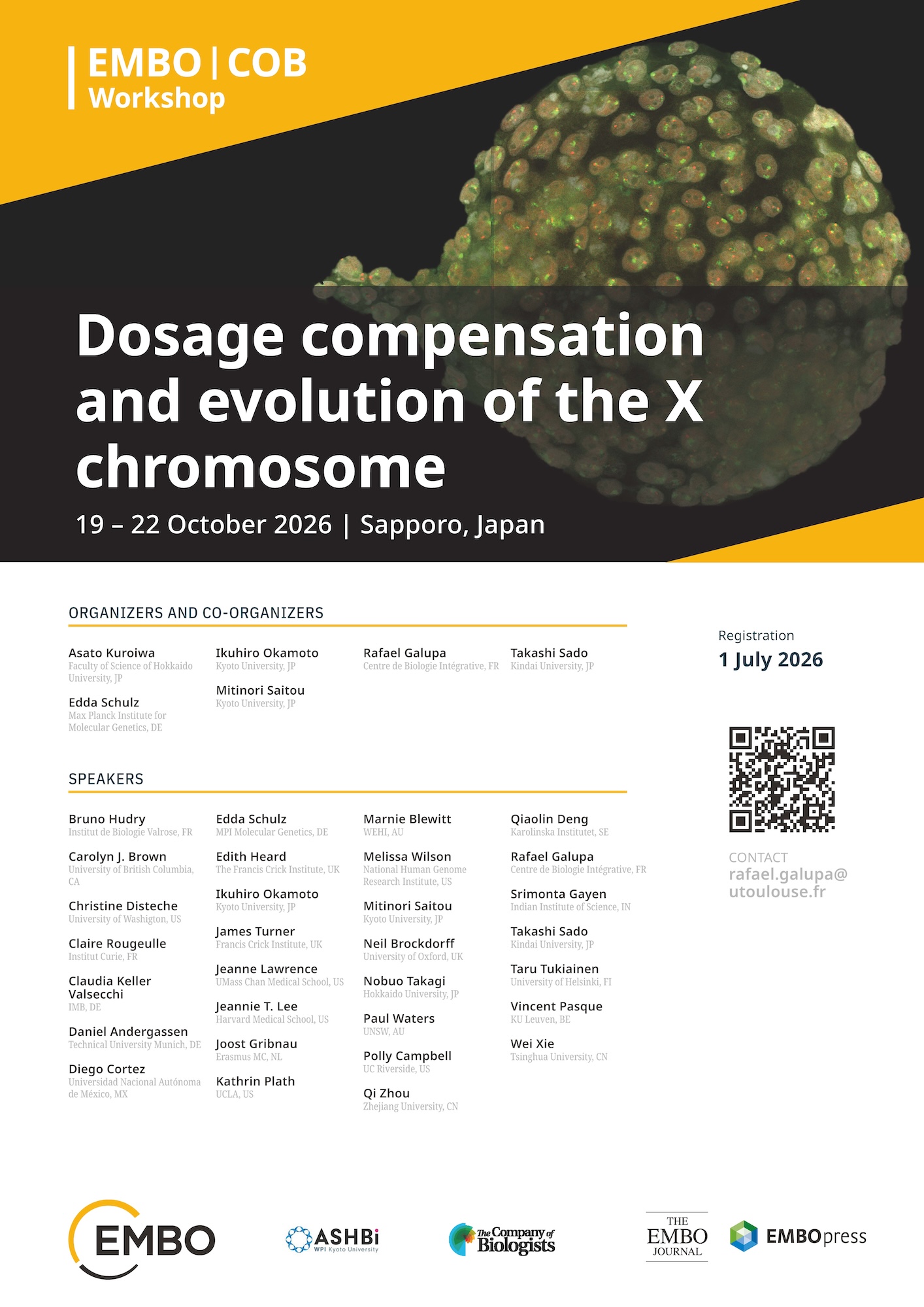 We are pleased to announce the EMBO Workshop "Dosage compensation and evolution of the X chromosome," co-organized by WPI-ASHBi (Kyoto University) and EMBO. The workshop will be held on 19–22 October 2026 at Hokkaido University, Sapporo, Japan.